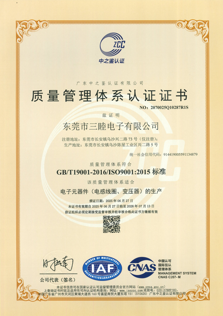 东莞市三睦电子有限公司深耕电子元器件领域近40年,是集产品设计、开发、制造于一体的专业生产型企业,核心聚焦高频变压器、触发圈、电感器等产品的研发与生产。公司坐落于东莞长安镇乌沙陈屋工业区,同时在台北南港区设立办事处,形成两岸联动服务体系。